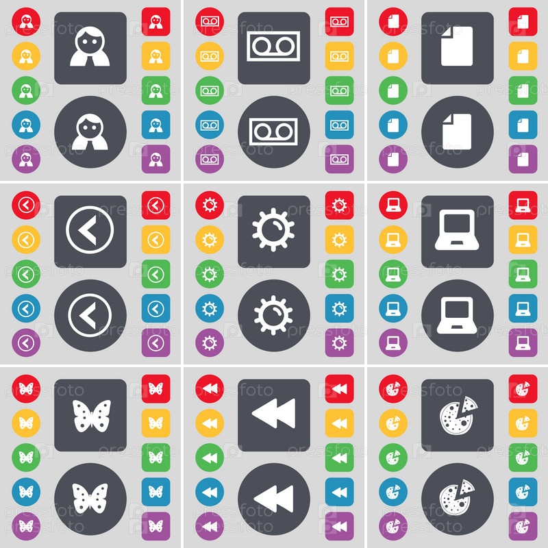 Аватар, кассеты, файл, стрелка влево, оборудование, ноутбук, бабочка, перевернуть, пицца значок символа. большой набор плоских цветных кнопок для вашего дизайна. вектор