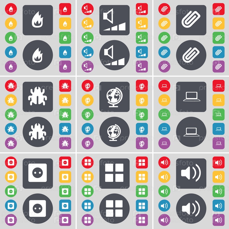 Огонь, объем, клип, ошибка, глобус, ноутбук, розетка, приложения, звук значка символа. большой набор плоских цветных кнопок для вашего дизайна. вектор
