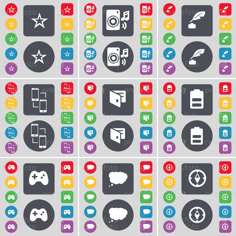 Звезда, спикер, чернила горшок, связи, бумажник, батарея, геймпад, чат облако, компас значок символа. Большой набор плоских, цветные кнопки для вашего дизайна. Вектор
