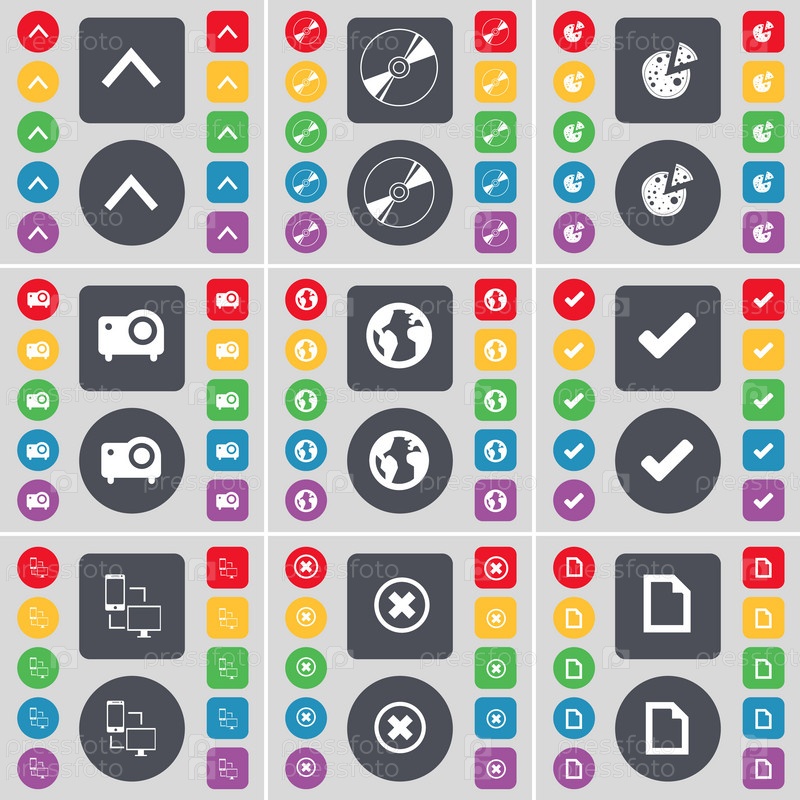 Стрелка вверх, диск, пицца, проектор, земля, тик, связи, остановить, символ значок файла. Большой набор плоских, цветные кнопки для вашего дизайна. Вектор