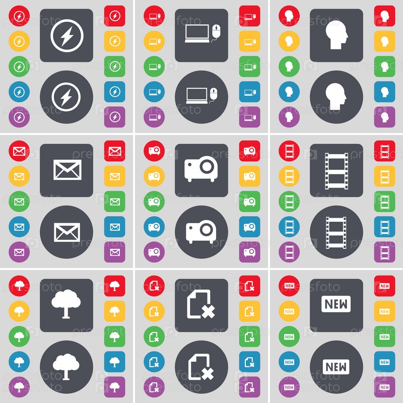 Вспышка, ноутбук, силуэт, сообщение, проектор, негативных пленок, дерево, файл, новый значок символ. Большой набор плоских, цветные кнопки для вашего дизайна. Вектор