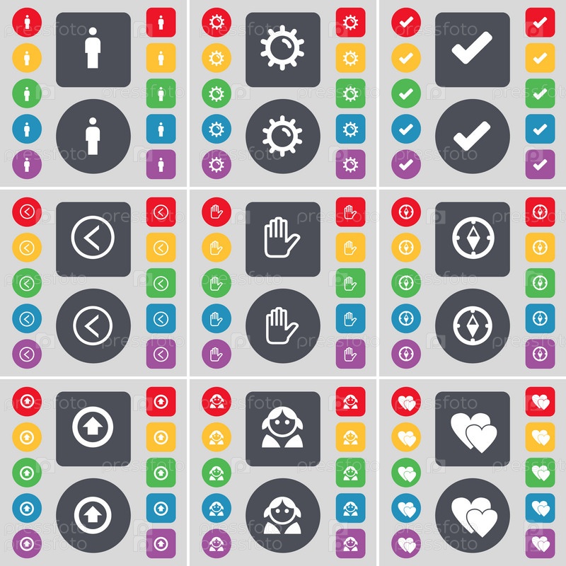 Силуэт, ремень передач, точка отсчета, стрелка влево, рука, компас, стрелка вверх, аватар, сердце иконка символа. большой набор плоских цветных кнопок для вашего дизайна. вектор