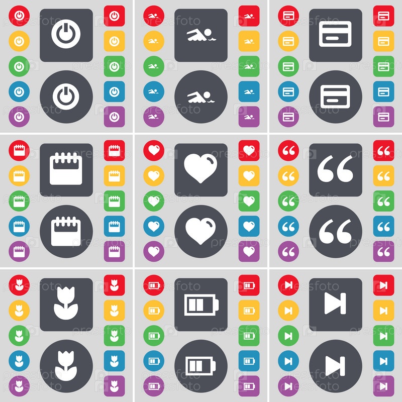 Мощность, пловец, кредитной карты, календарь, сердце, кавычки, цветок, батареи, средства массовой информации показывать значок символа. Большой набор плоских, цветные кнопки для вашего дизайна. Вектор