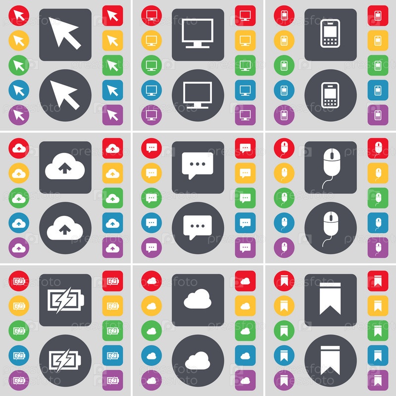 Курсор, монитор, мобильный телефон, облако, чат пузырь, мышь, зарядки, значок символа метки. Большой набор плоских, цветные кнопки для вашего дизайна. Вектор