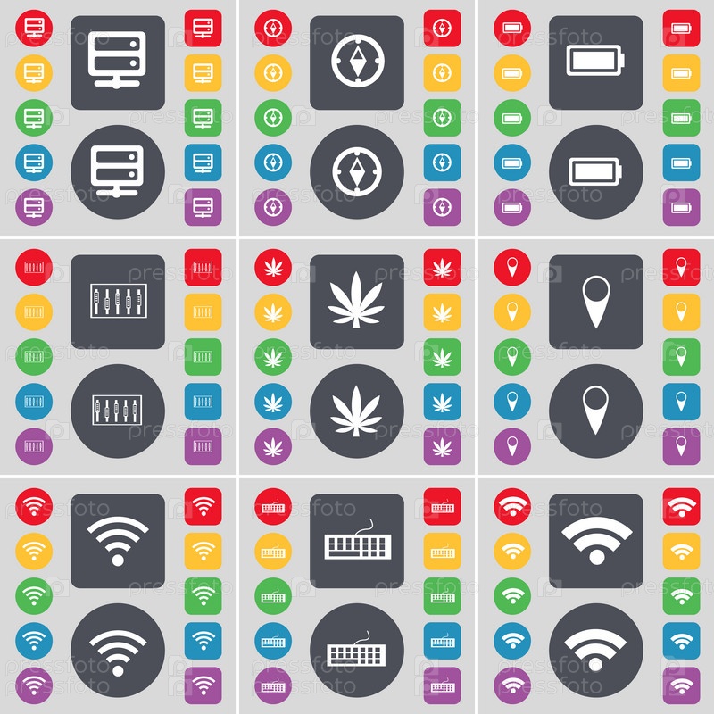 Серверы, компас, батарея, эквалайзер, марихуана, контрольно-пропускной пункт, Wi-Fi, иконки символов Клавиатура Большой набор плоских цветных кнопок для вашего дизайна Вектор