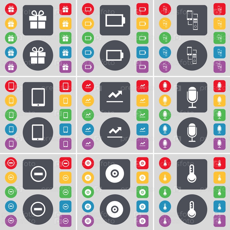 Подарок, батарея, связь, Таблетный ПК, граф, микрофон, минус, диск, символ значка термометра. Большой набор плоских цветных кнопок для вашего дизайна. вектор