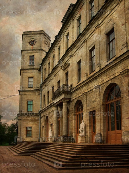 Старые классические дворец с статуями возле главного входа в стиле гранж и ретро