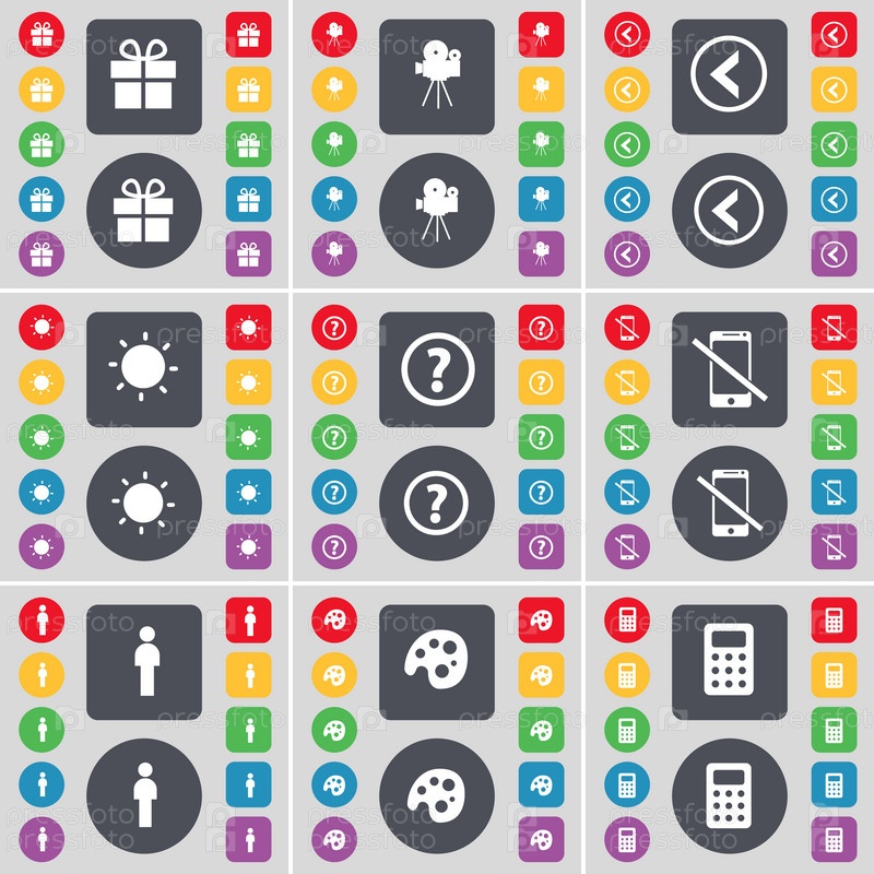 Подарок, пленочной камеры, стрелка влево, свет, вопросительный знак, смартфон, силуэт, палитра, символ значок календаря. Большой набор плоских, цветные кнопки для вашего дизайна. Вектор