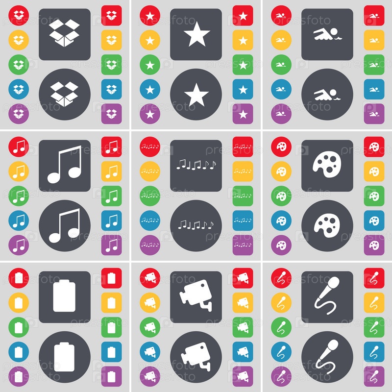 Dropbox, звезда, плаватель, примечание, палитра, батарея, CCTV, символ значка микрофона. большой набор плоских цветных кнопок для вашего дизайна. вектор