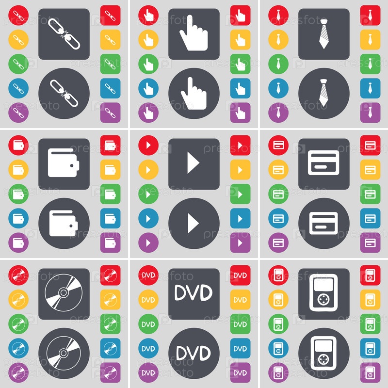 Ссылка, рука, галстук, кошелек, средства массовой информации играть, кредитные карты, диск, DVD, игрок значок символа. большой набор плоских цветных кнопок для вашего дизайна. вектор