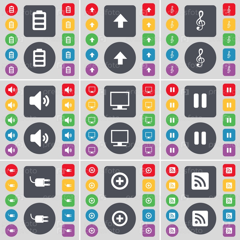 Аккумулятор, стрелка вверх ключ, динамик, монитор, пауза, розетка, плюс, значок символа RSS. Большой набор плоских цветных кнопок для вашего дизайна. вектор