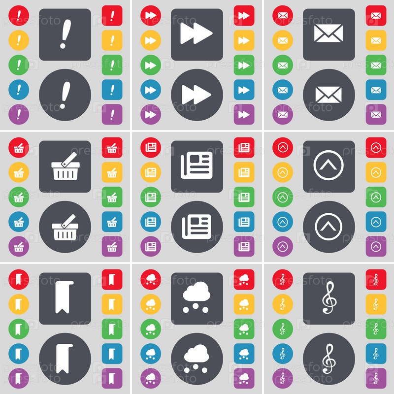 Восклицательный знак, Rewind, сообщение, корзина, газета, стрелка вверх, маркер, облако, КЛЕФ значок символа. большой набор плоских цветных кнопок для вашего дизайна. вектор