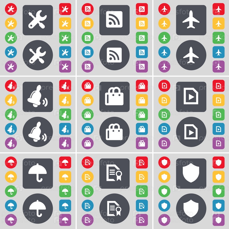 Гайковерт, RSS, самолет, Белл, корзина покупок, СМИ, зонтик, текстовый файл, значок символа. большой набор плоских цветных кнопок для вашего дизайна. вектор