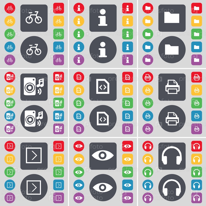 Велосипед, информация, папка, динамик, файл, принтер, Arrowr правое, видение, символ значок наушников. Большой набор плоских цветных кнопок для вашего дизайна. вектор