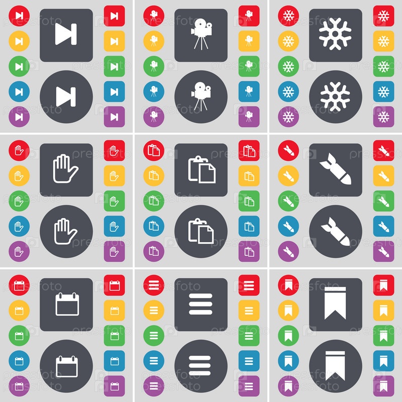 Перейти СМИ, пленочной камеры, снежинка, рука, обследования, ракета, календарь, приложения, значок символ маркера. Большой набор плоских, цветные кнопки для вашего дизайна. Вектор