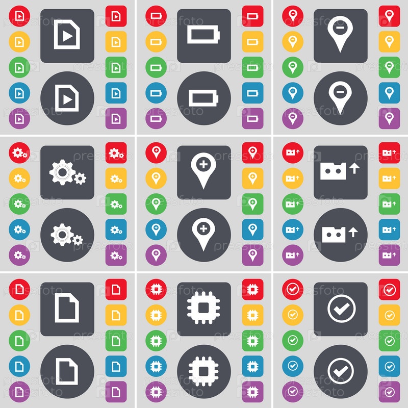 Файл мультимедиа, батарея, контрольно-пропускной пункт, снаряжение, кассеты, файл, процессор, отметьте значок символа. Большой набор плоских, цветные кнопки для вашего дизайна. Вектор