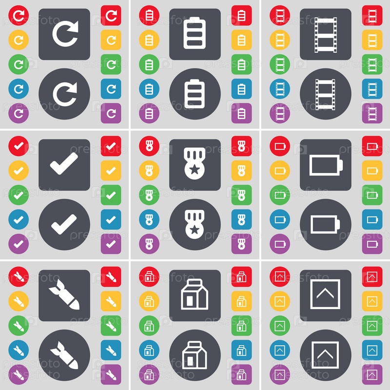 Перезагрузка, батарея, негативных пленок, тик, медаль, ракета, упаковка, стрелка вверх значок символа. Большой набор плоских, цветные кнопки для вашего дизайна. Вектор