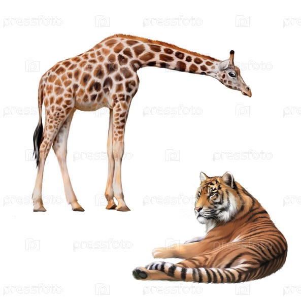 Тигр и жираф. на белом фоне