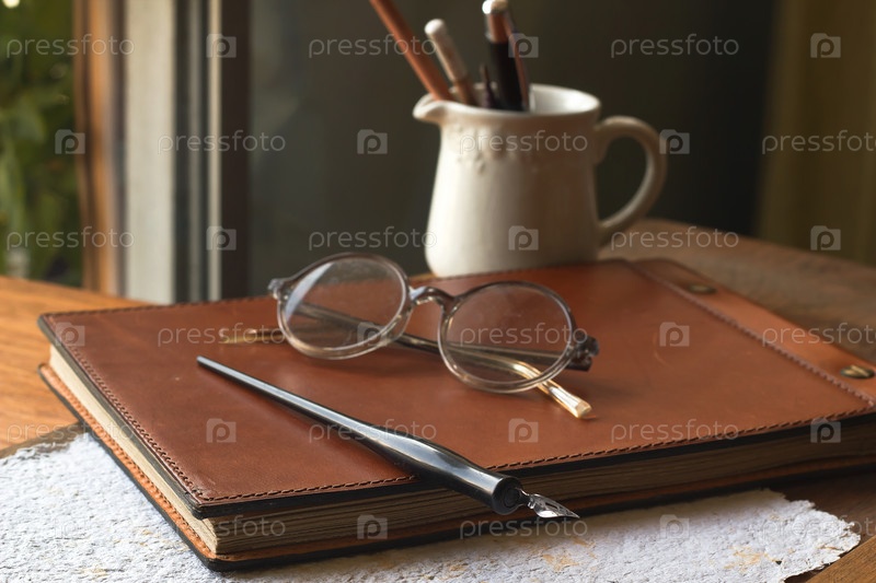 Ретро очки, тетради, чернила, ручки на деревянных фоне