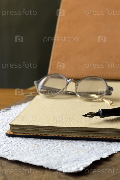 Ретро очки, тетради, чернила, ручки на деревянных фоне
