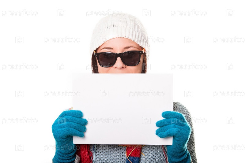 Девушка в вязаной шляпе и солнцезащитных очках держит пустой бланк