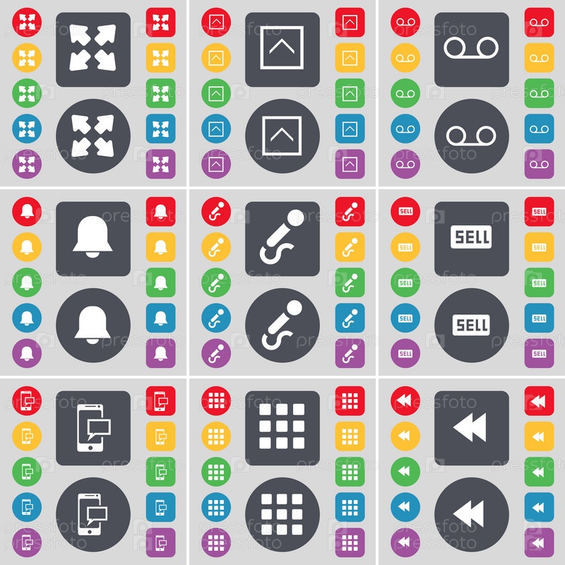 Полный экран, стрелка вверх, кассеты, уведомления, микрофон, продажи, SMS, приложения, прокрутка значка символа. большой набор плоских цветных кнопок для вашего дизайна. вектор