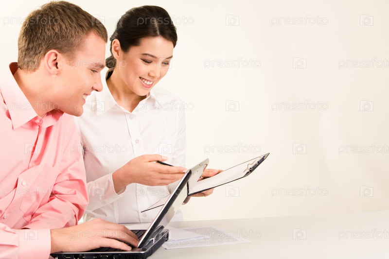 Фото деловых партнеров, сидящих на рабочем месте и смотрящих с улыбкой на документ