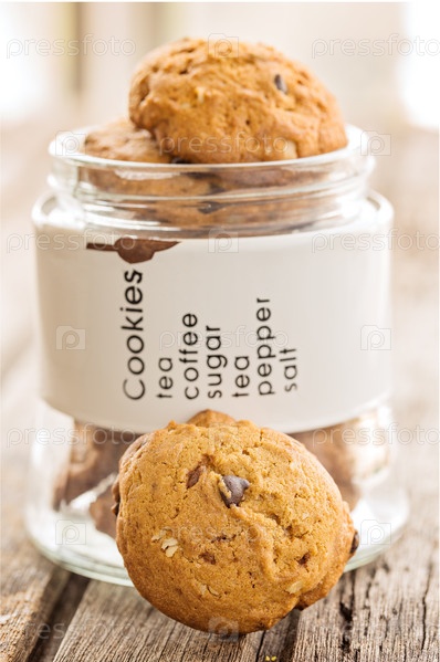 Ручной шоколад в печенье в стеклянной банке, на деревянной доске