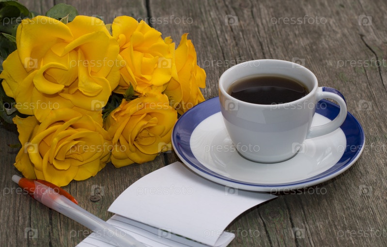 Блокнот с ручкой, кофе и букет из ярких желтых роз