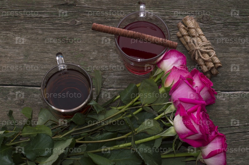 Два стакана чая и букет роз, сверху вид
