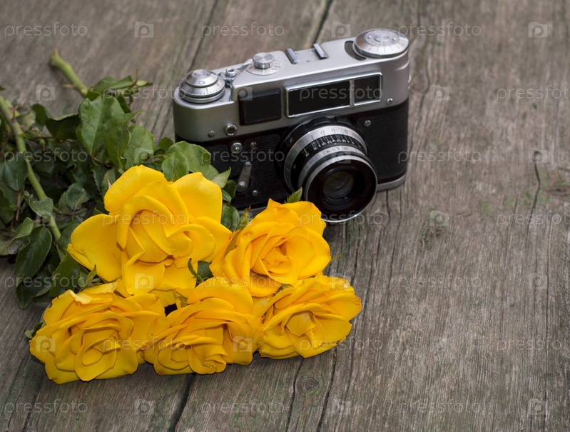 Желтые розы и ретро камеры за ними на столе