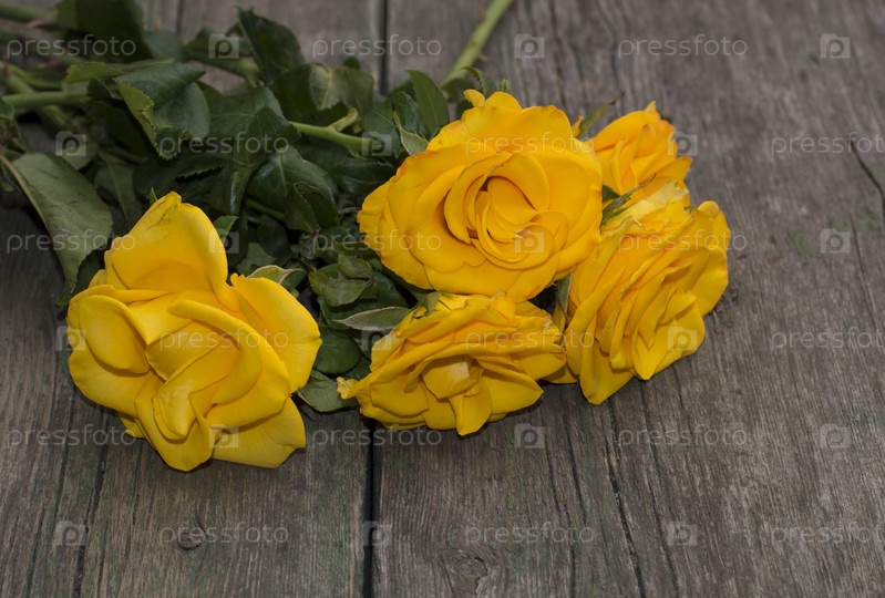 Красивый букет из желтых роз на деревянном столе