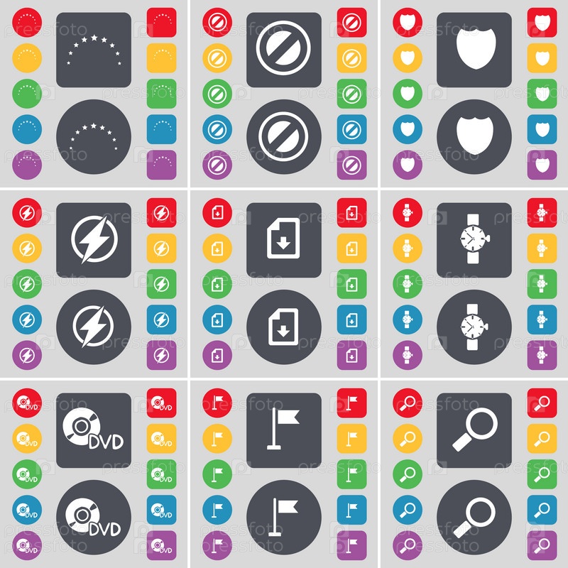 Звезды, стоп, знак, Флэш, скачать файл, наручные часы, DVD, дырка для гольфа, символ значка увеличительного стекла. Большой набор плоских цветных кнопок для вашего дизайна. вектор
