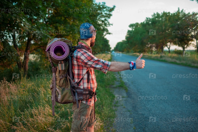 Турист с рюкзаком ловит машину