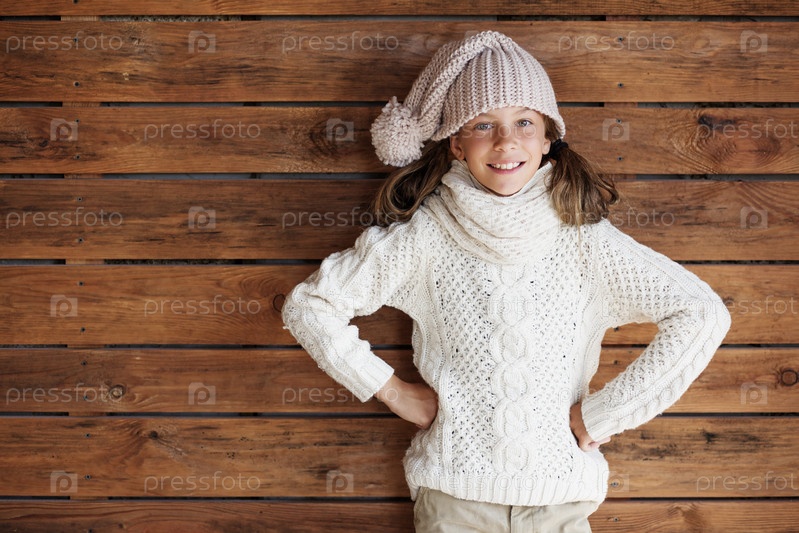 Ребенок, позирует в вязаной одежды