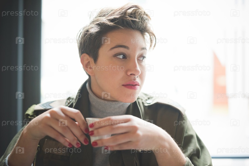 Молодая красивая женщина с короткими волосами хипстер