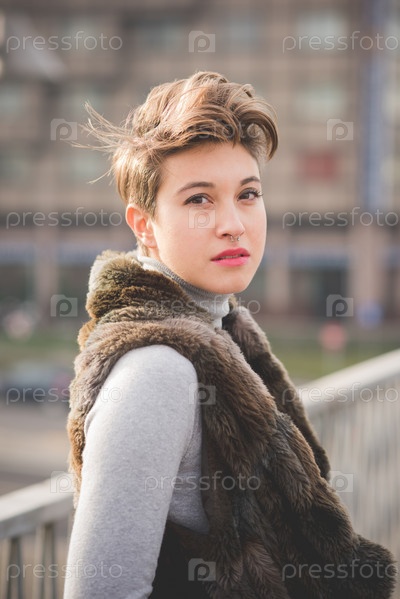 Молодая красивая женщина с короткими волосами хипстер