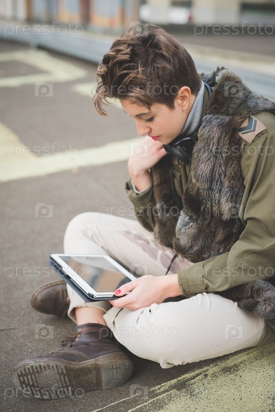 Молодая красивая женщина с короткими волосами хипстер