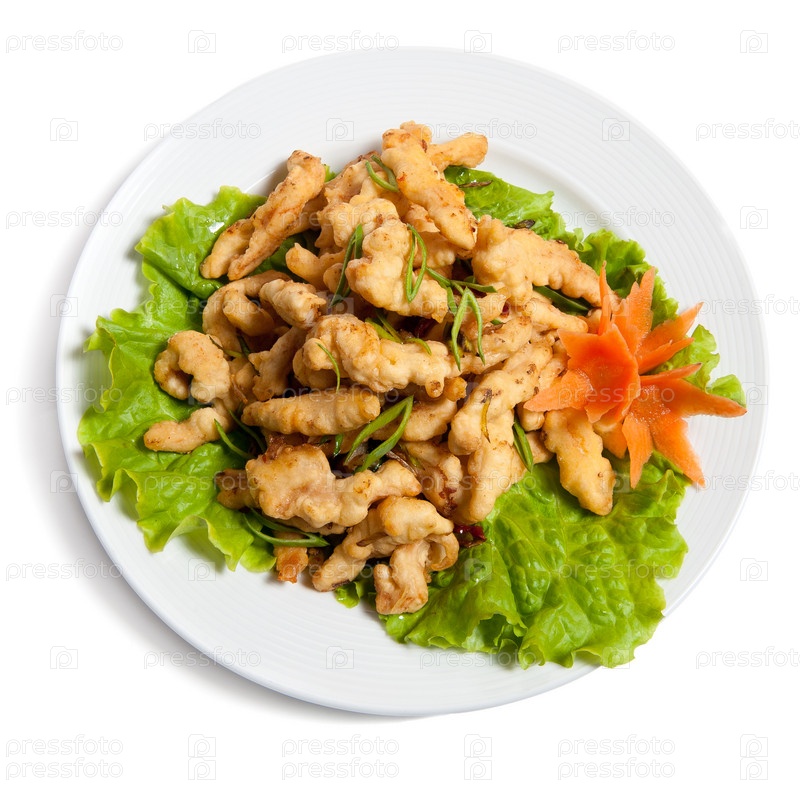Курица на тарелке, на белом фоне