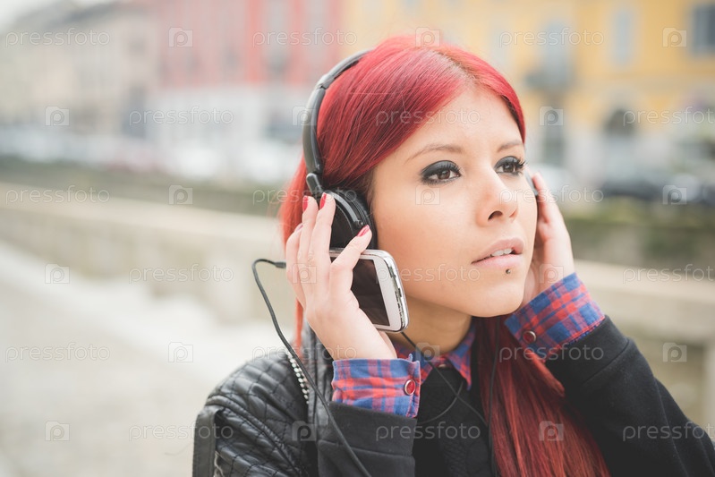 Молодые красивые женщина с рыжими волосами образ жизни прослушивания музыки