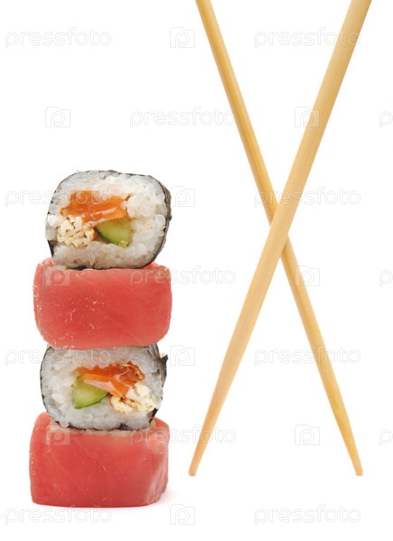 Суши с палочками для еды на белом фоне