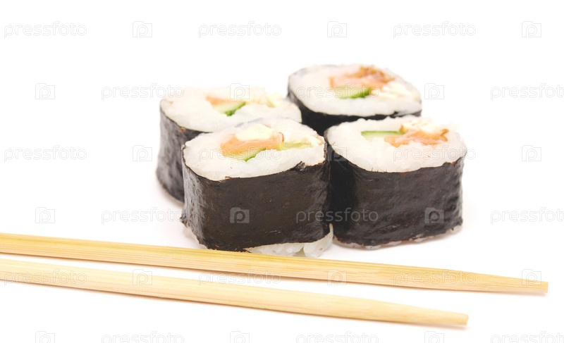 Суши с палочками для еды на белом фоне