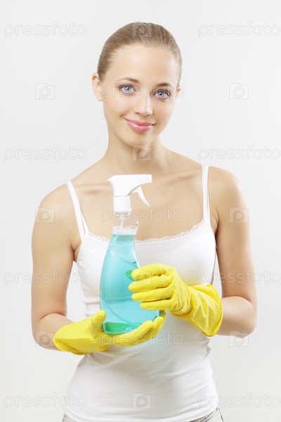 Девушка в хозяйственных перчатках с моющим средством в руках