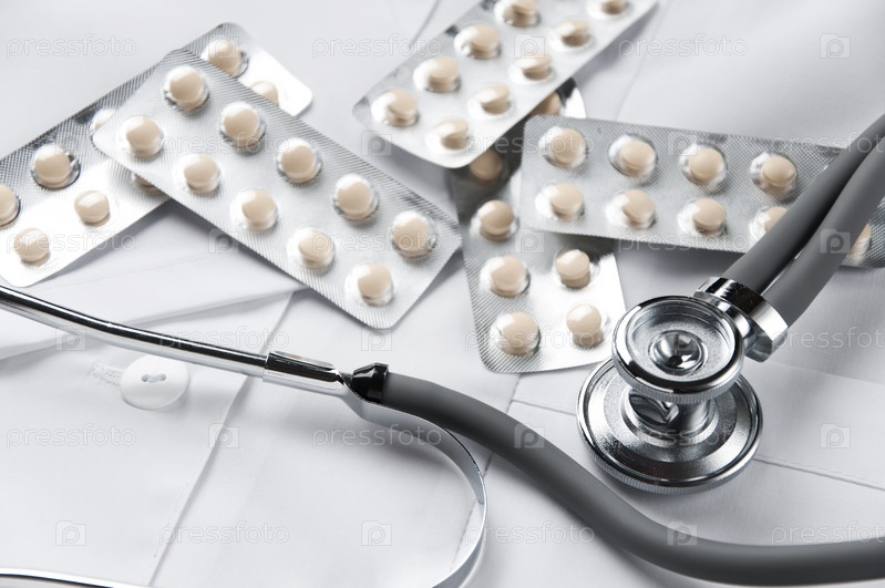 Стетоскоп и блистеры с таблетками на медицинском халате