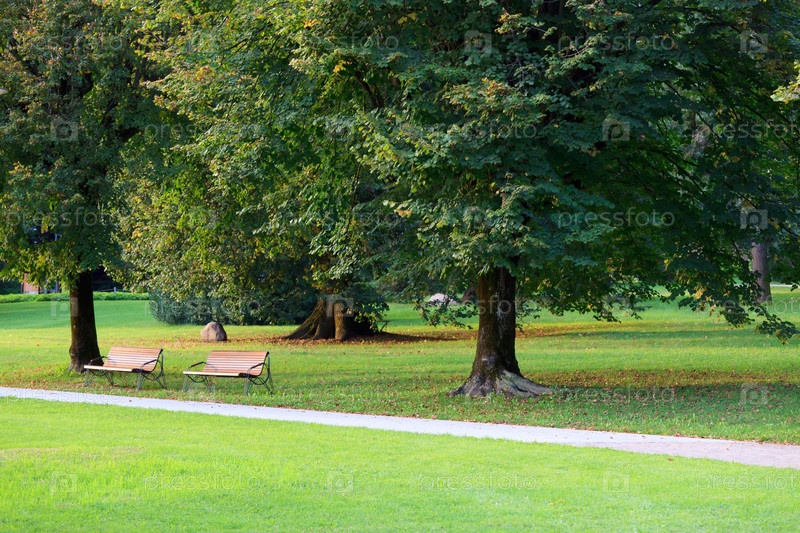 Осенний парк со скамейками под огромными деревьями в Левико, Италия