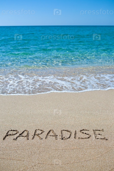 Море и песчанный пляж. На песке написано по-английски "Рай"