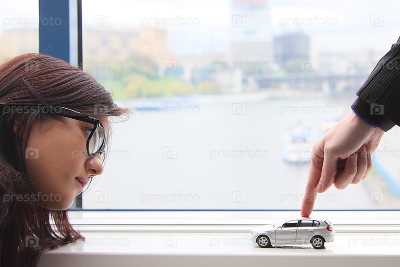 Молодая девушка в очках смотрит на модель игрушечной машины