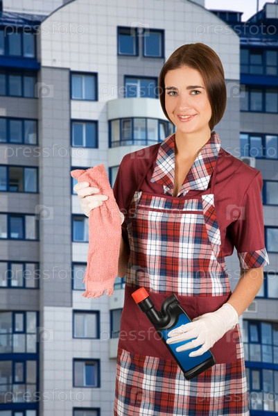 Горничная с тряпкой и моющим средством на фоне здания
