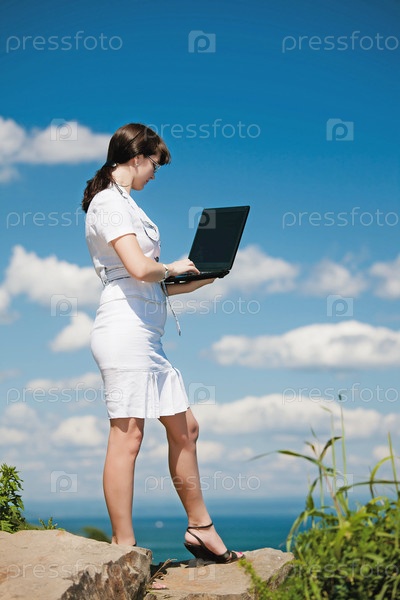 Молодая девушка с ноутбуком на берегу моря