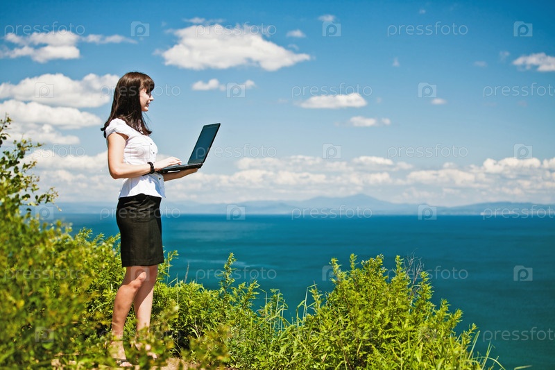Молодая девушка с ноутбуком на берегу моря